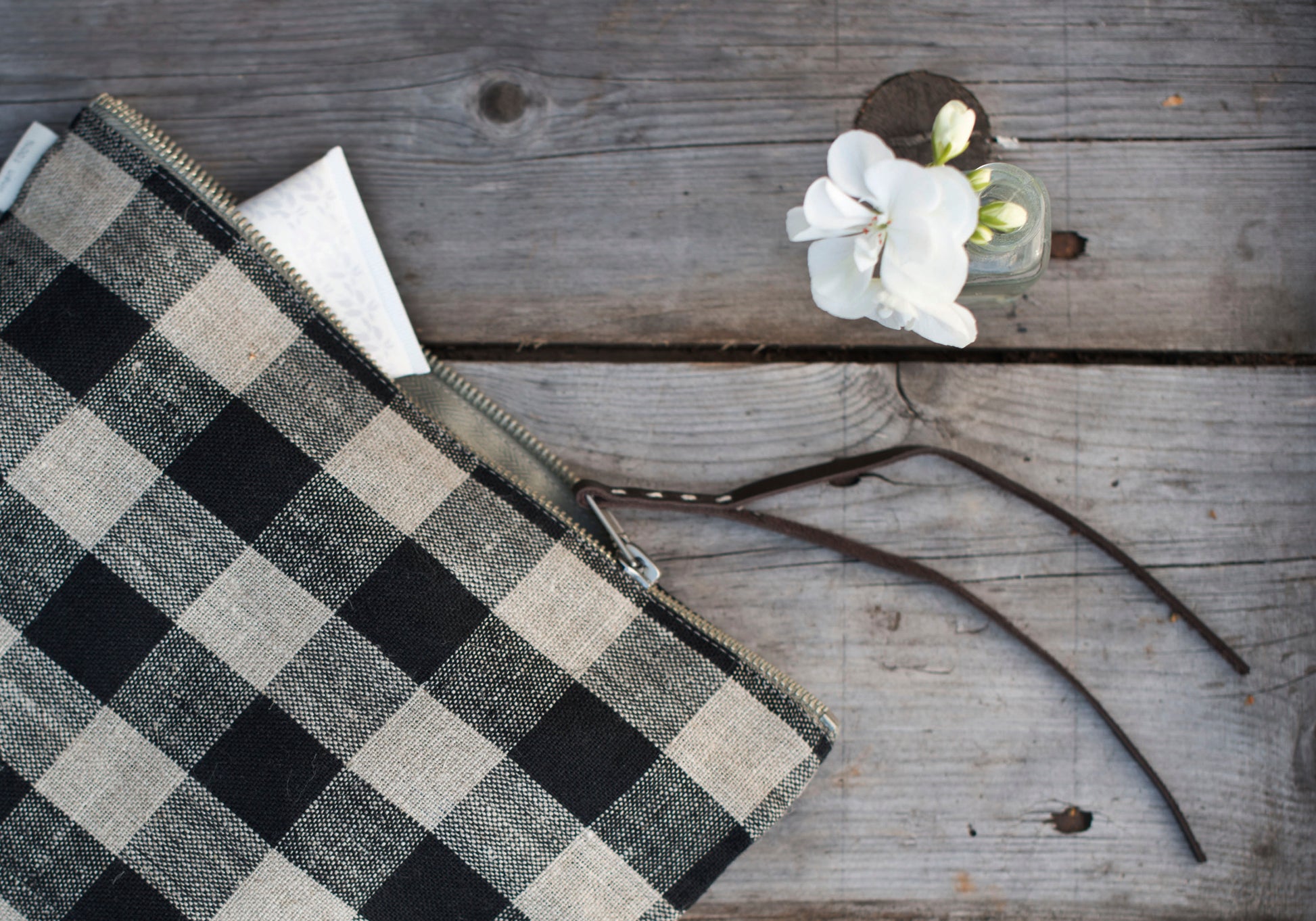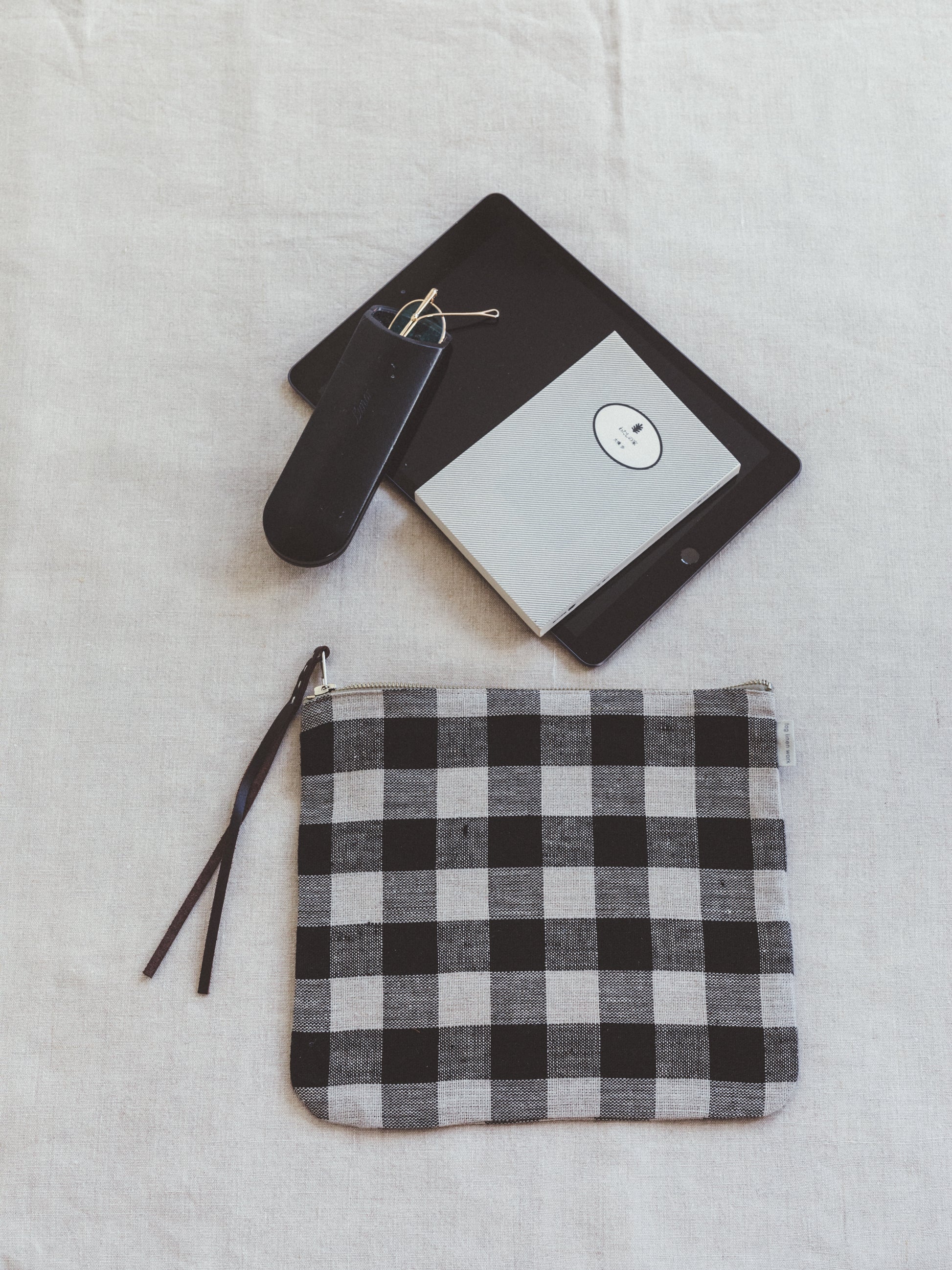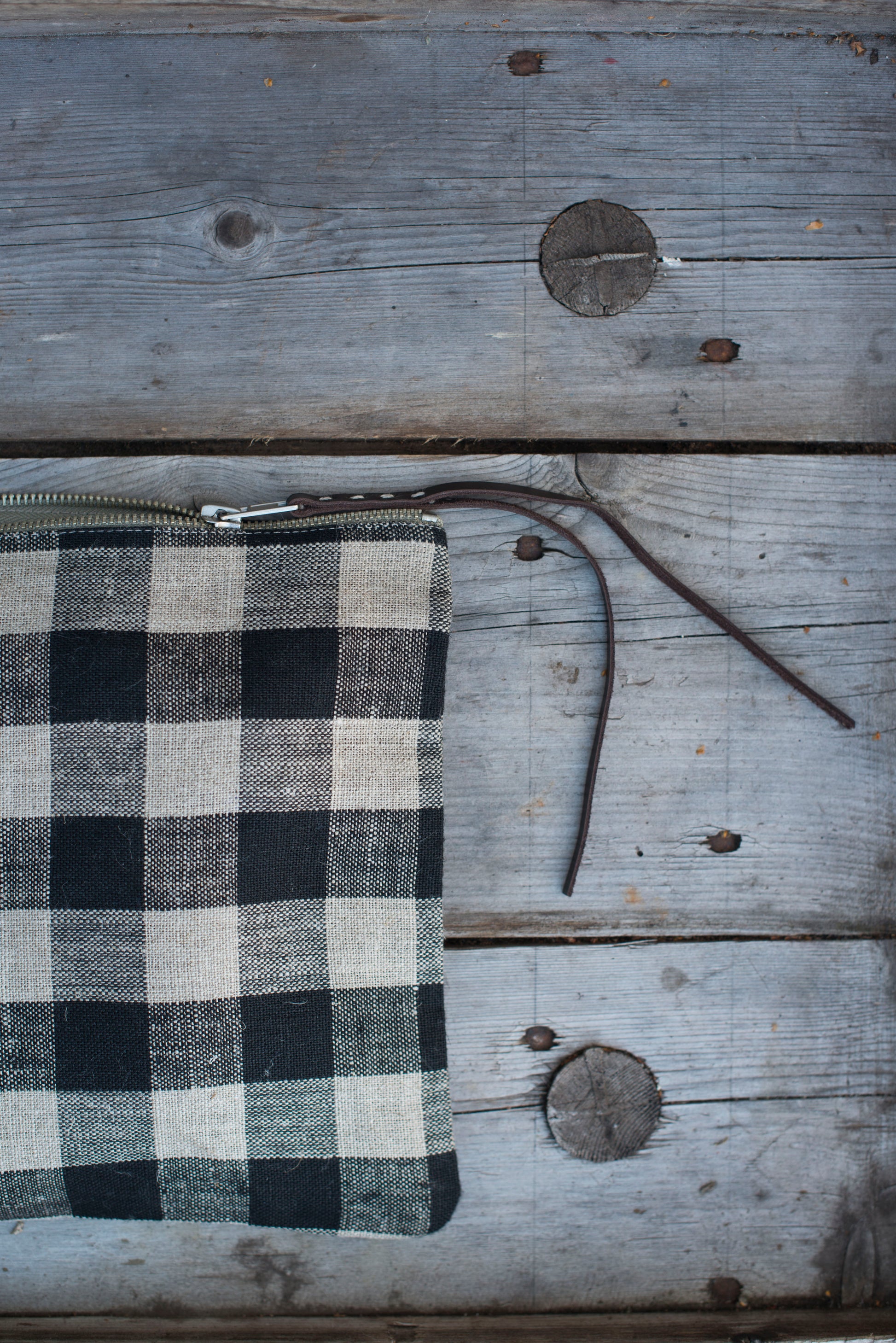 此款小袋採用厚亞麻織物製成,耐用的金屬拉鍊和皮革流蘇拉手
