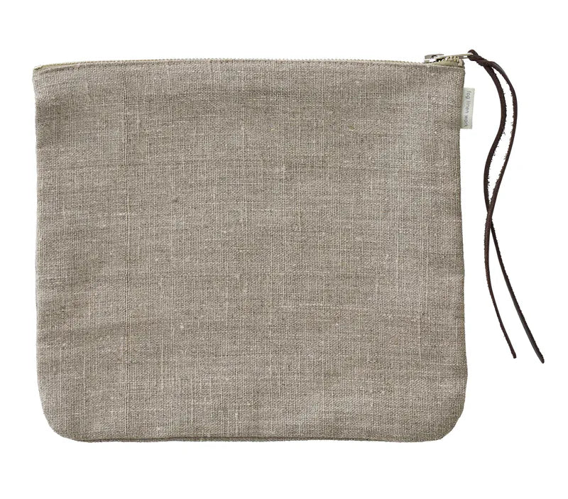 此款小袋採用厚亞麻織物製成,耐用的金屬拉鍊和皮革流蘇拉手