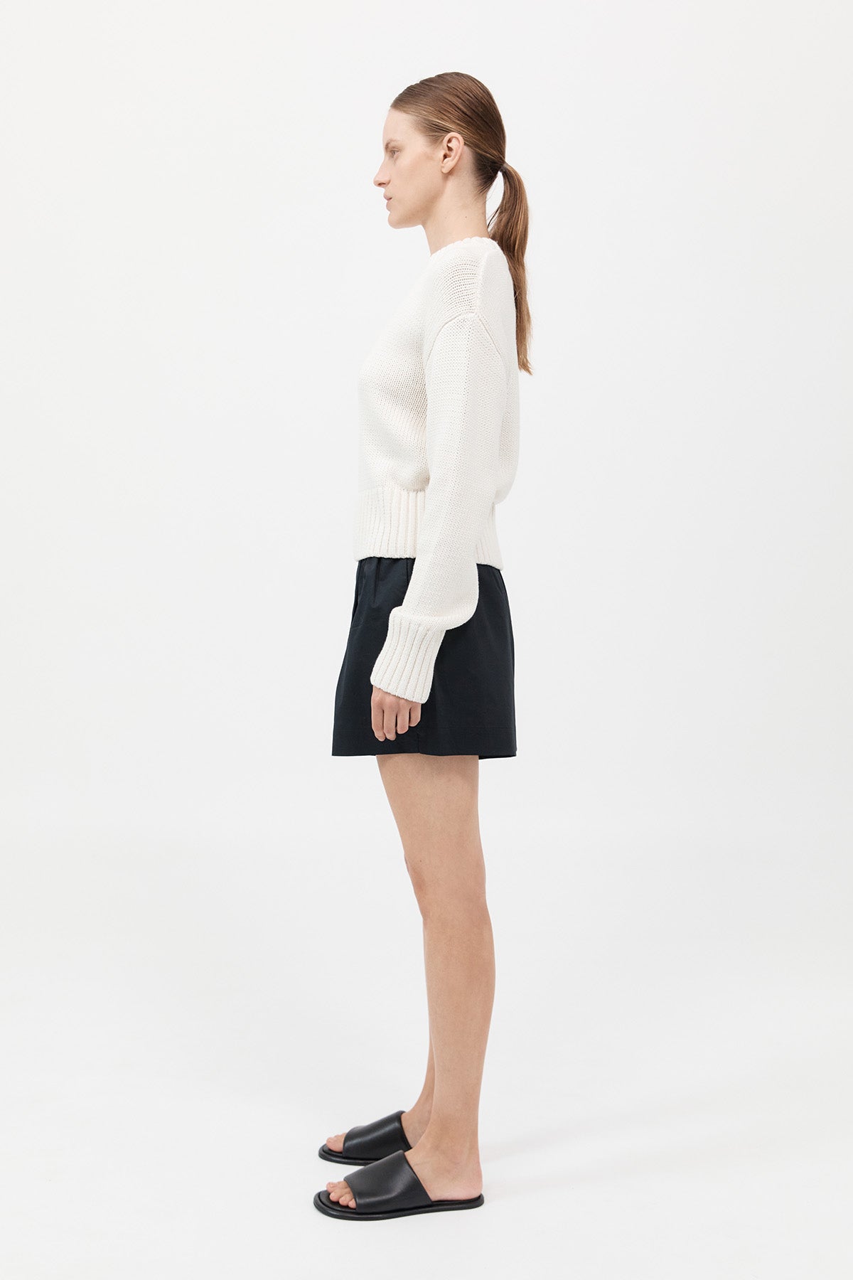 這款平角短褲的靈感源自傳統男款睡衣,採用鬆緊腰部、正面中央非功能性扣環細節、假門襟、小側開衩和側縫口袋。