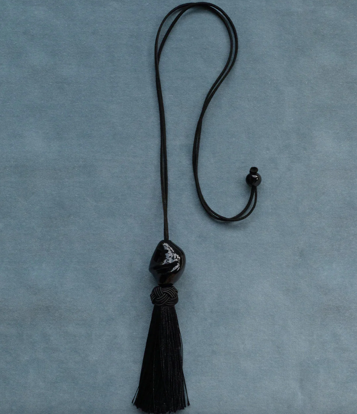 該玻璃吊墜完全由玻璃製成,不規則黑色吊墜和編織流蘇組成,由絨面革帶支撐,末端飾有冰絲流蘇。