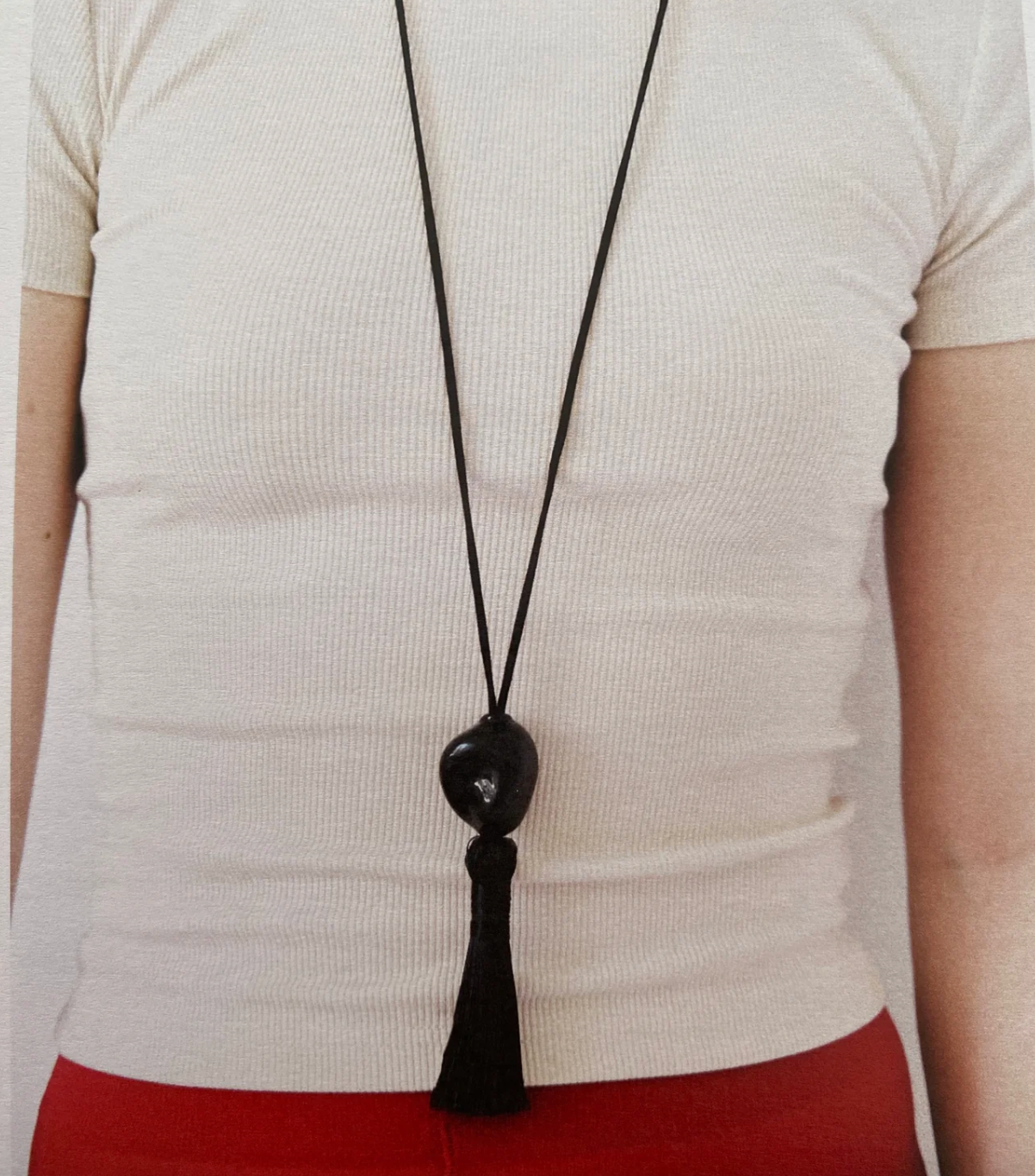 Long necklace featuring an irregular ivory pendant and a tassel. Its centrepiece is a handblown glass bead supported by a suedette strap, adorned with an ice silk tassel at the end.
