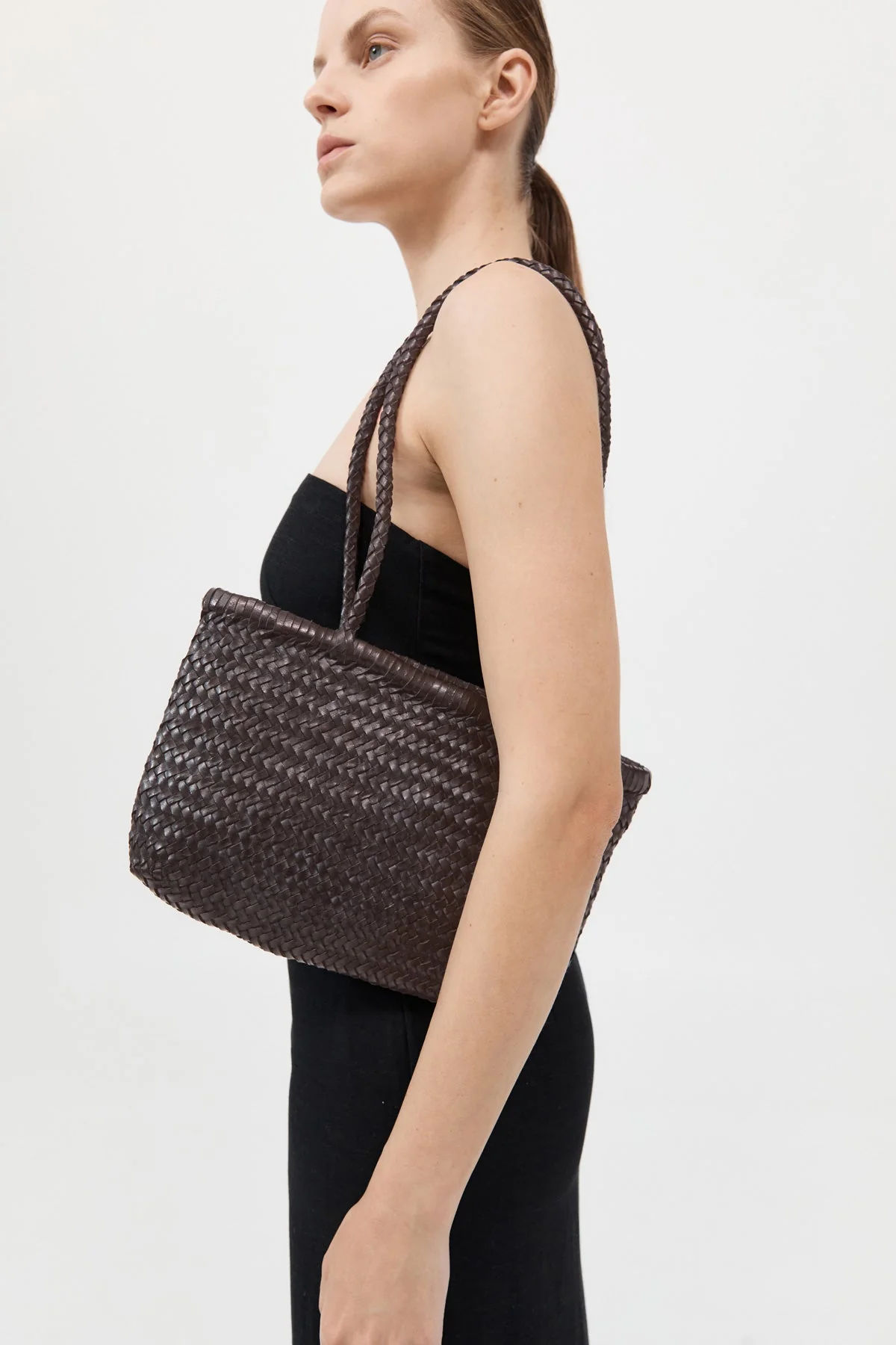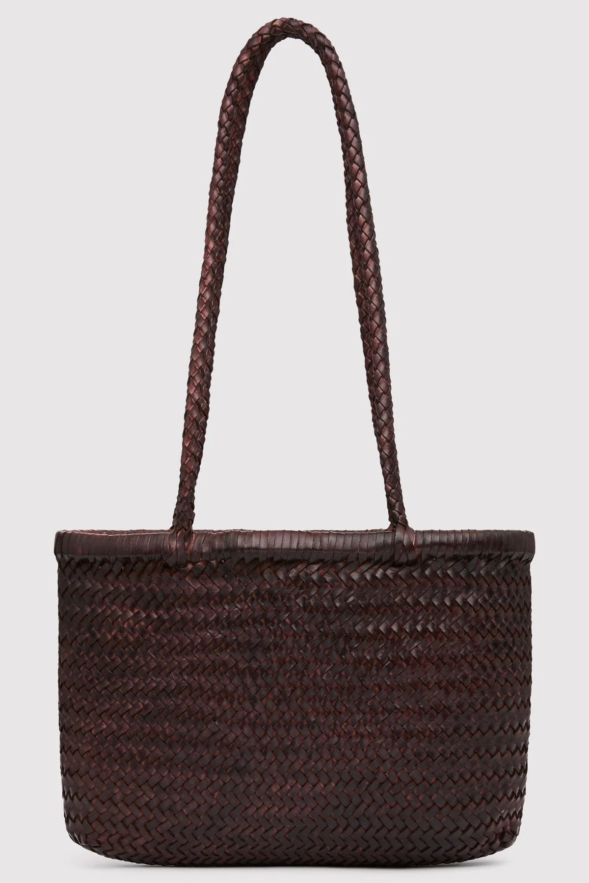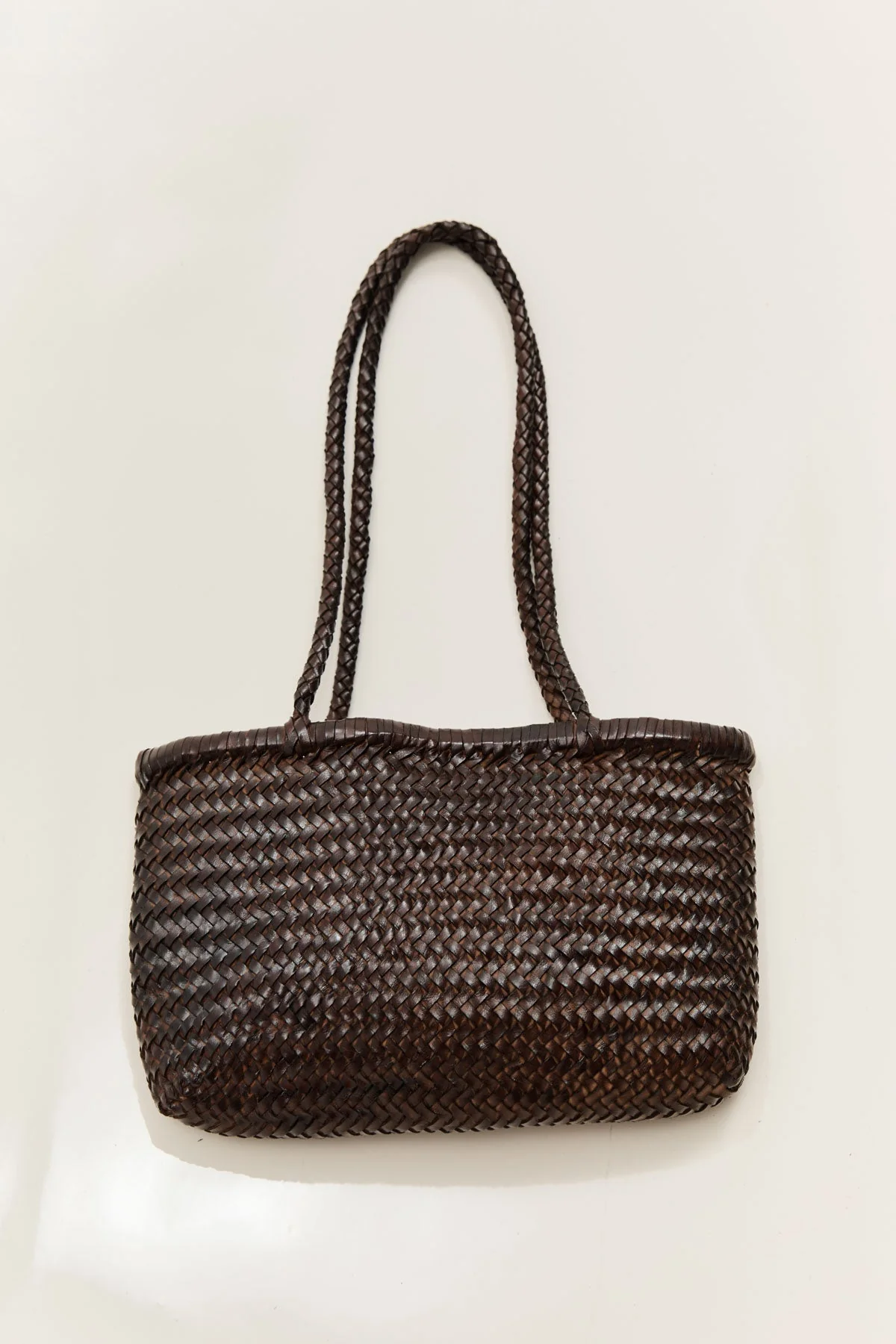Mini tote silhouette, double shoulder handle, leather woven body, unlined